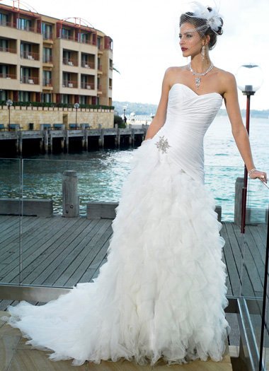 | Straplez çok katlı gelinlik modeli. Göğüs dekolteli çan etekli gelinlik modeli. |